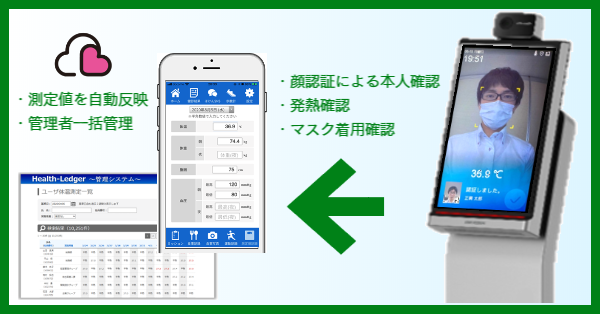 従業員の体温管理を行う機能を強化しました。顔認証サーマルカメラにより社員の体温測定(体表面温度)値をHealth Ledgerへ自動反映できるようになりました。1秒以内に社員を判定し、入場許可の判定を自動化できます。マスク越しでも顔認証、体温測定に問題はありません。また、勤怠管理システムやゲート開閉の連携など他システムとの連携も可能です。