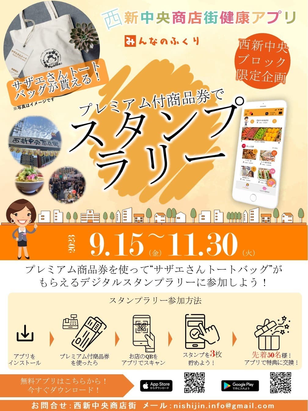 正興ITソリューション株式会社と株式会社NTTデータ九州が提供している地域経済の活性化アプリ「みんなのふくり」に、スタンプラリー機能が追加されました。9月15日より販売される西新中央商店街のプレミアム商品券を対象店舗で使うと、アプリ内でスタンプを獲得することができます。スタンプを3つ貯めると、オリジナルサザエさんトートバックをプレゼントいたします。