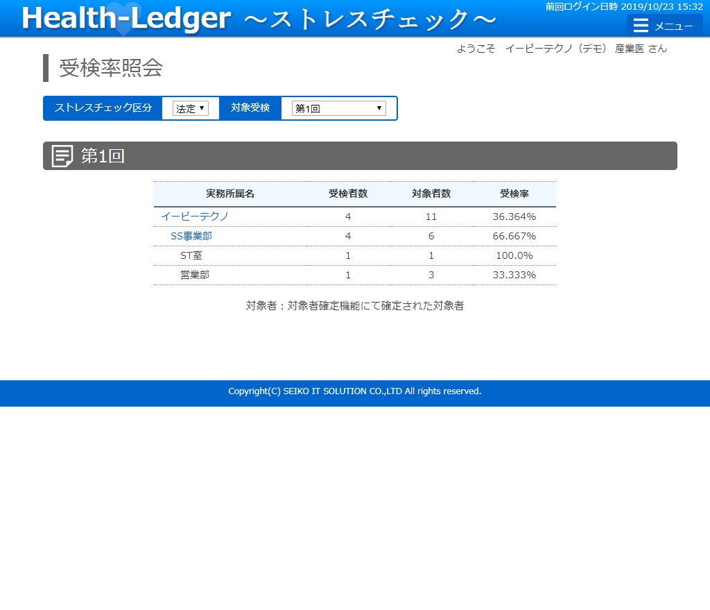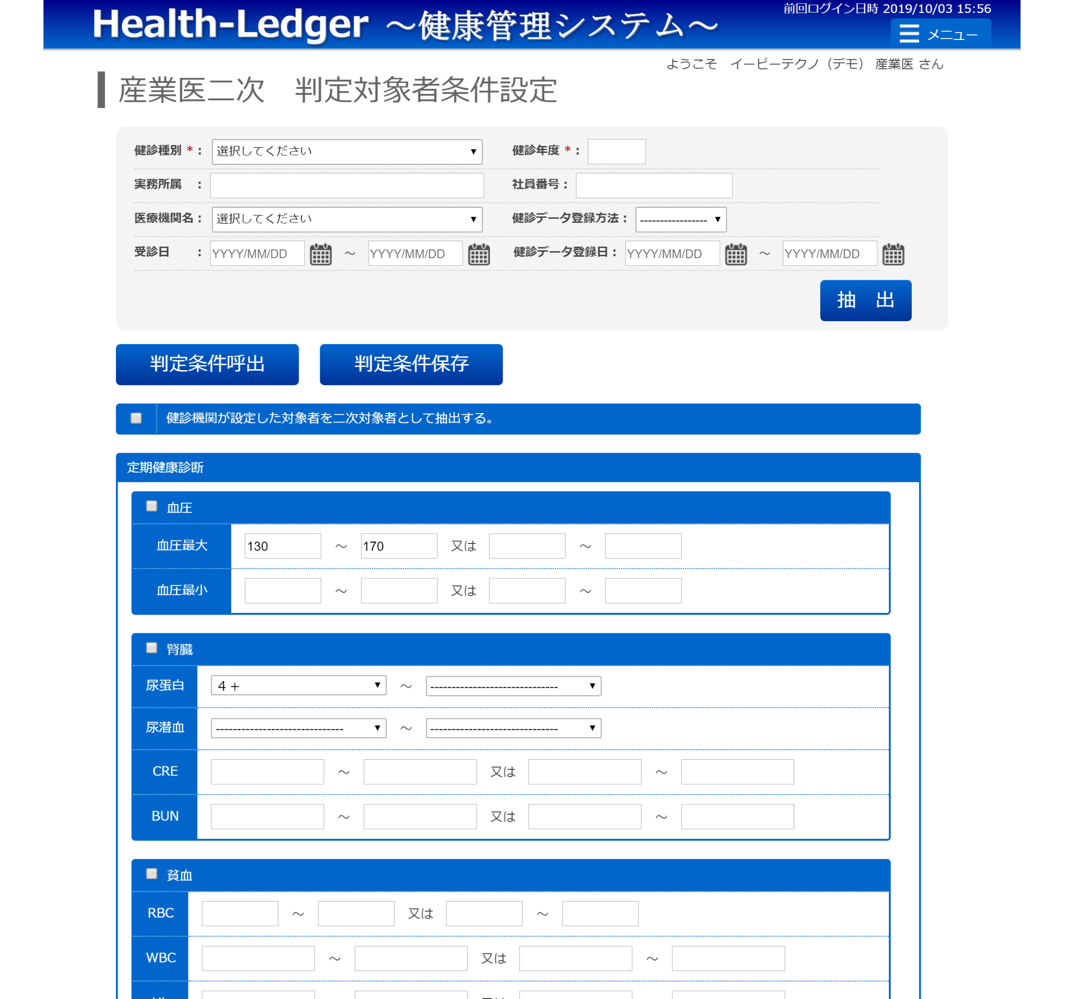 Health Ledgerには、健診結果、ストレスチェックの一元情報管理に加え、さまざまな条件による抽出ができます。また、実際の人事部殿、産業医殿の運用に沿ったメニュー構成になっており、センシティブな情報をしっかり守るセキュリティ上で運用することが可能です。